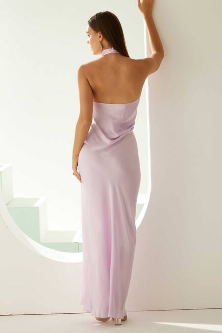 Lilac halter neck dress with a solid base, draped silhouette and side slit