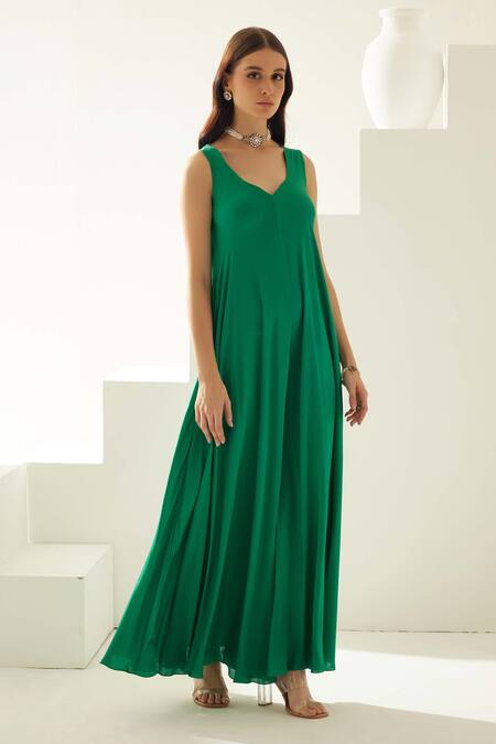 Green modal jumpsuit featuring a leaf neckline and sleeveless design