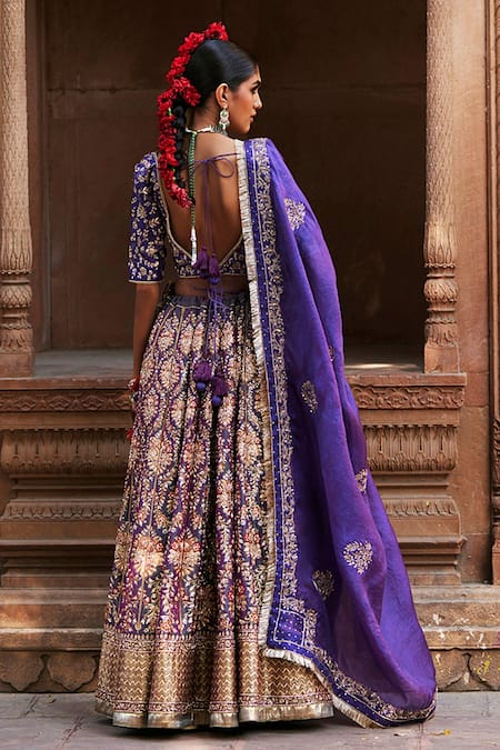 Blue flared katan silk lehenga featuring all over amaryllis garden zardozi embroidery in golden accents. Paired with a half sleeves V neck padded blouse adorned with intricate zardozi florence vine embroidery and an organza dupatta with hand embroidered zardozi borders and ornate motifs.