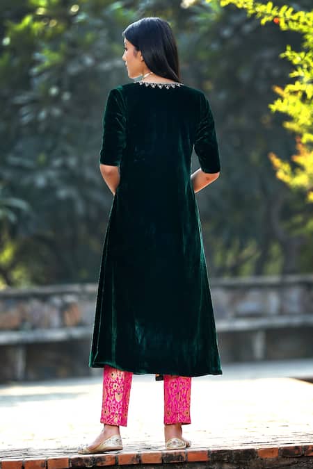 Dark green silk velvet angarkha featuring Mughal pattern contrast zari, thread, and cut dana embroidered hand borders with side tasselled tie-up. Paired with contrast pink pure silk banarasi brocade straight fit pant adorned with an all-over floral pattern.