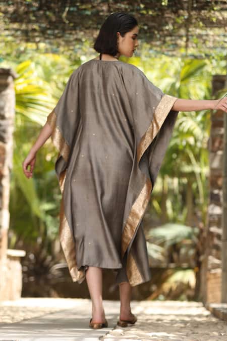 Grey Silk Zari V-neck Benaras Bloom Border Handloom Pure Kaftan