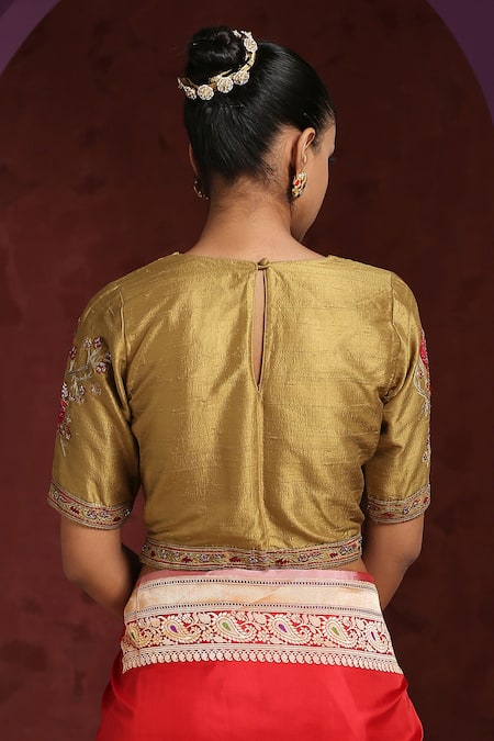 Buy_Weaver Story_Gold Silk Embroidery Round Neck Bird Hand Blouse _Online_at_Aza_Fashions