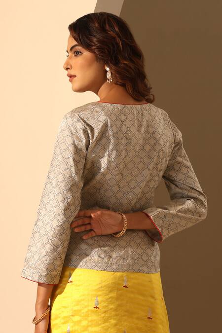 Buy_Weaver Story_Silver Tissue, Silk Sequins Round Neck Block Print Blouse_at_Aza_Fashions