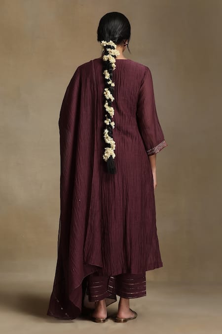 Wine kurta featuring notched neckline, three quarter sleeves, and intricate sequin, thread, and bead embroidered floral motifs. Paired with coordinating embroidered pant and dupatta in Chanderi and cotton satin fabric.