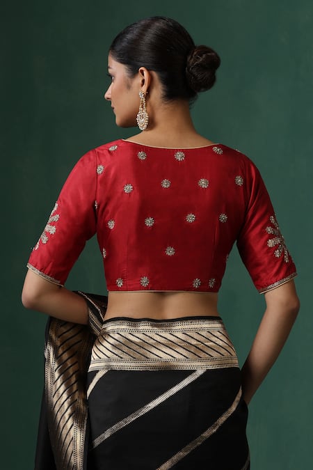 Vermillion red saree blouse featuring floral zardozi work on a pure silk base