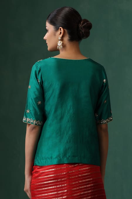Green kurta style saree blouse featuring zardozi and cutdana embroidery on a pure silk base