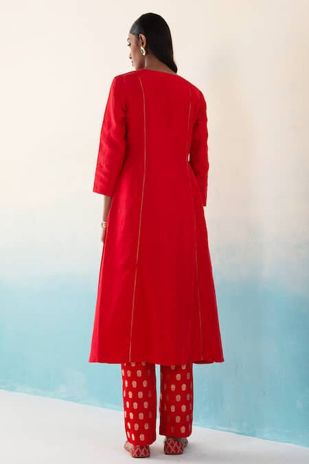 Red lined kalidar straight-fit kurta with concealed scallop hem placket. Paired with embroidered pant with zari booti motifs. Comes with an organza hand embroidered dupatta.