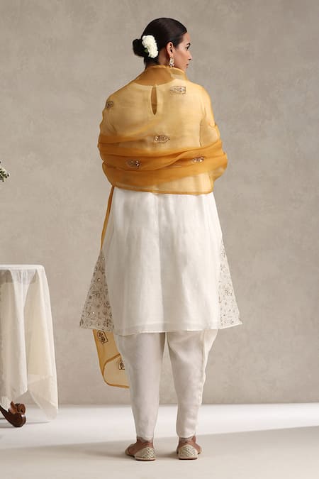 Off-white A-line kurta featuring floral gota patti embroidery on the yoke and organza detailing on the neck. Paired with scallop border tulip pant and mustard dupatta.