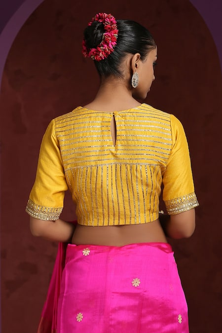 Yellow blouse made of soft munga silk fabric featuring intricate gota patti work and zardozi hand embroidery