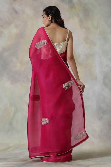 Pink organza saree in hand embroidered floral zardozi booti work and piping detail border.