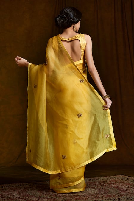 Yellow organza saree in hand embroidered floral zardozi work. Comes with yellow satin running blouse fabric.