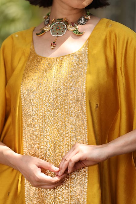 Yellow kaftan featuring batwing sleeves and handwoven sanjaab details