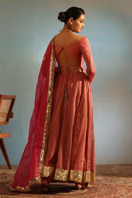 Buy_Weaver Story_Pink Tissue, Silk Lace Scoop Neck Lapa Border Anarkali Churidar Set