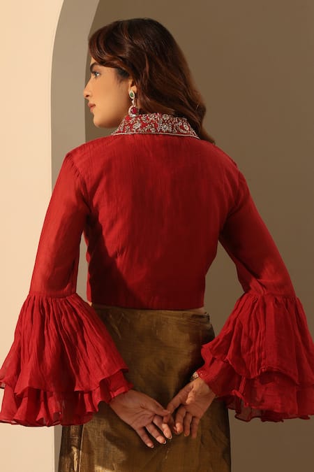 Red Chanderi Embroidery Collared Layered And Ruffled Sleeve Blouse