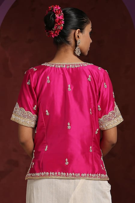 Pink Satin, Silk Embroidery Plunge Neck Mughal Border Jacket Top