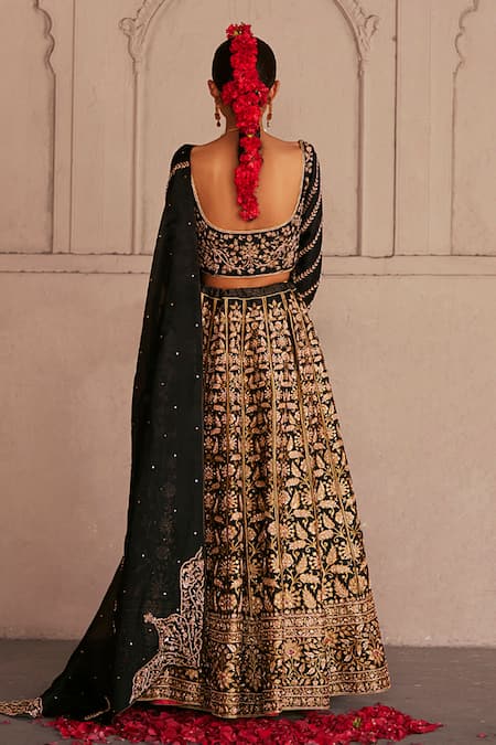 Black Silk, Organza, Kota Persian Florid Zardozi Embroidered Lehenga Blouse Set