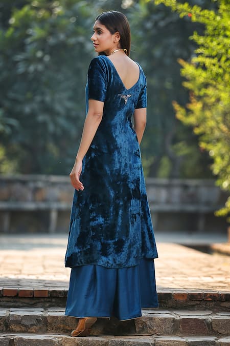 Teal blue silk velvet A-line kurta featuring a V neck and half sleeves. Paired with a flared pure munga silk sharara with a half elasticated waistband.