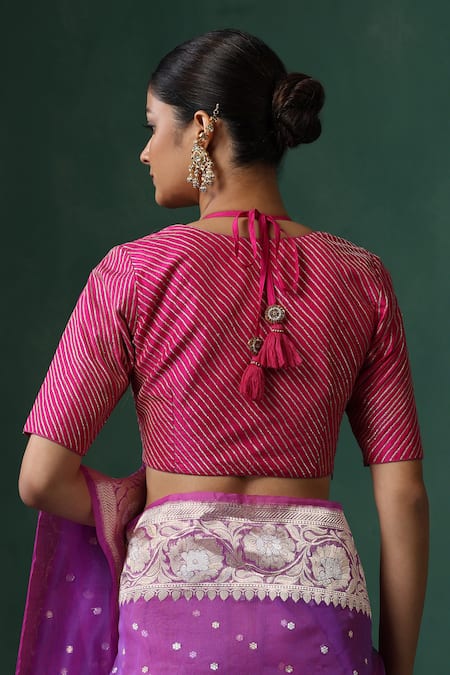 Pink saree blouse featuring gota embroidery and halter strap details in pure silk