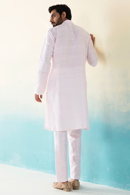 Baby pink kurta with pure raw silk fabric base & mandarin collared neckline. Paired with pant.
