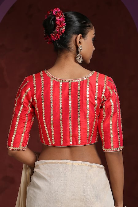 Red blouse crafted from raw silk featuring a hand embroidered striped pattern with sequins and dori work