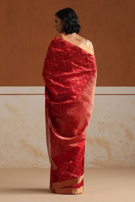 Red Chanderi saree featuring intricate patterns and a running blouse