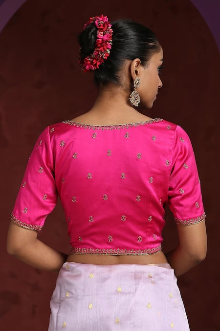 Pink blouse featuring hand embroidered zardozi work with floral patterns and thin border embroidery