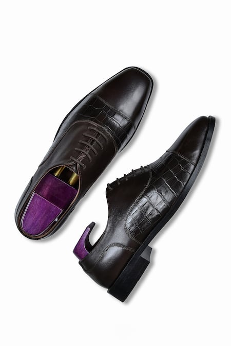Brown oxford shoes featuring croc embossed detail on a genuine leather base