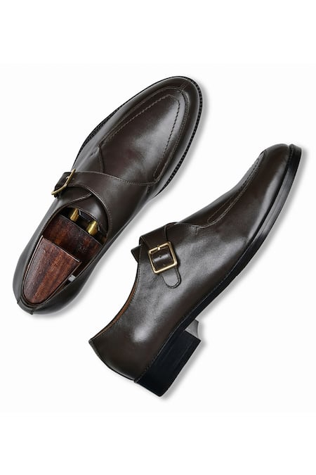 Brown genuine leather single monk strap shoes featuring a split toe design