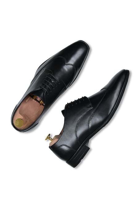 Black genuine leather derby shoes featuring a distinctive wing cap design and sleek lace tie-up