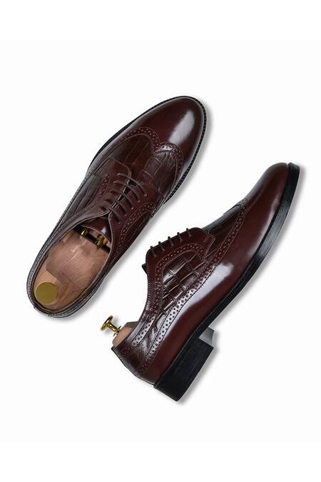 Burgundy lace-up derby shoes featuring a textured pattern and brogue detailing