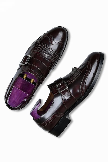 Burgundy monk shoes crafted from brushoff leather featuring buckle detailing