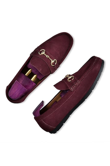 Burgundy suede leather moccasin featuring embellished buckle detail on the vamp