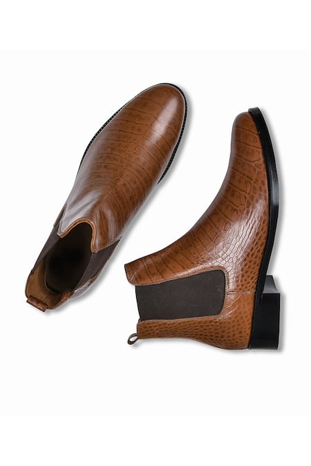 Brown Chelsea boots crafted from croco leather featuring a textured design and tapered toe