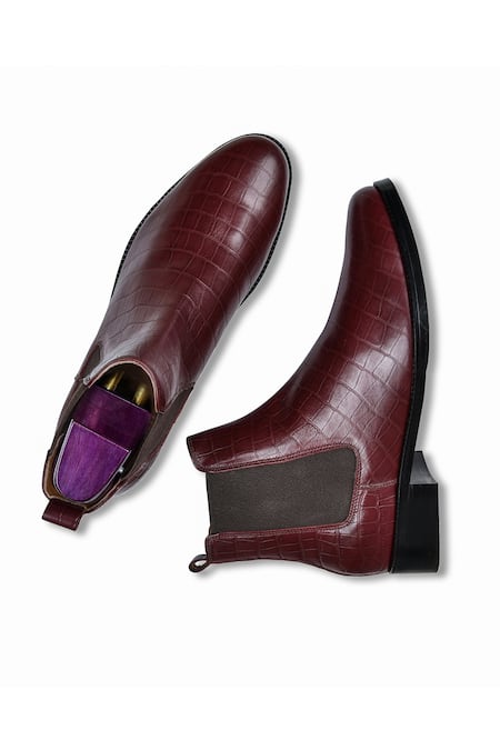 Burgundy Chelsea boots featuring a textured croco leather finish