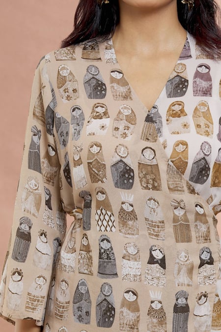 Beige Organza, Satin V-neck Doll Print Wrap Top With Pant