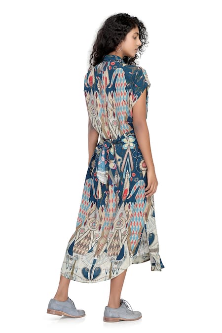 Blue Crepe Beads Collared Knotted Shirt Dress With Slip