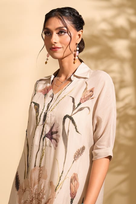White kurta featuring big flower print and bead embroidery. Paired with printed pant showcasing similar floral patterns.
