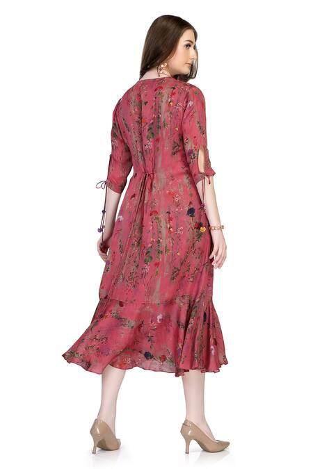 Pink Organza, Satin Tassels Collared Blossom Print Midi Dress