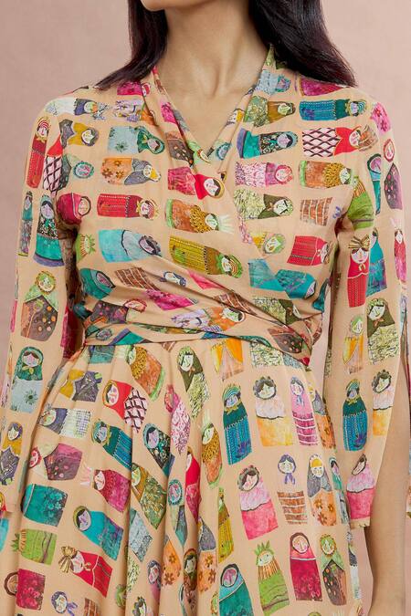 Peach dress featuring an all-over doll print with a wrap-around detail on the yoke and an asymmetric hem