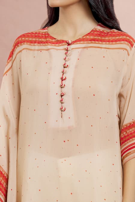 Brown Crepe Embroidery Round Neck Dot Print Kaftan Tunic