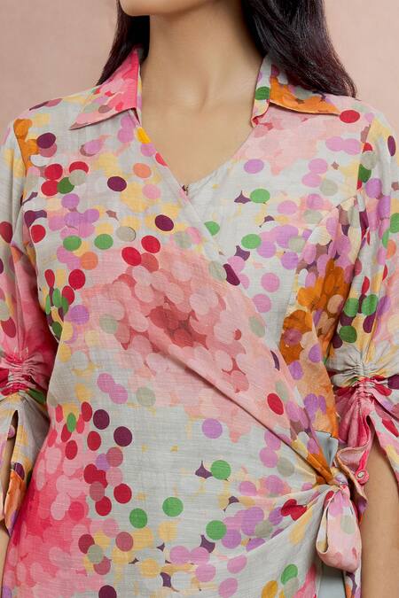 Coral Organza, Satin Shawl Neck Dot Print Side Drape Flap Jumpsuit