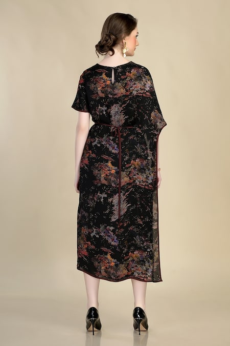 Black midi dress featuring a double layered design and waterlily print in organza