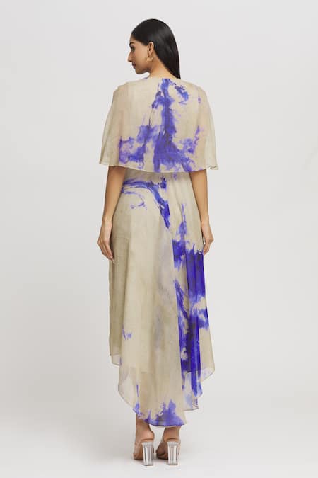 Grey and purple brush stroke pattern dress featuring a V neck and half sleeves