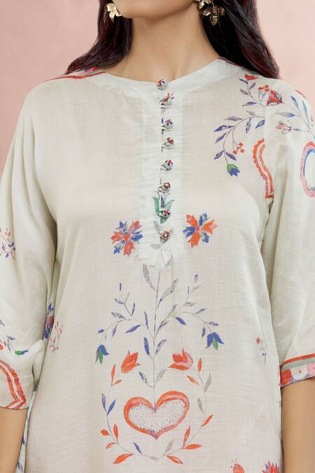 Peach and white kaftan featuring an asymmetric silhouette with floral and heart prints. Paired with stripe print pants, this set is designed in cotton silk fabric.