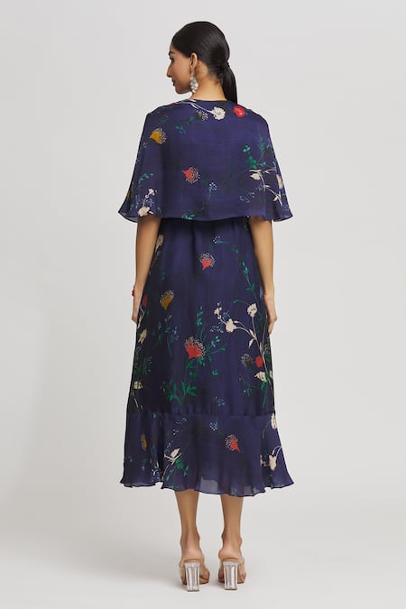 Navy wrap dress featuring floral print with tassels and hand embroidery