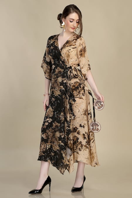 Black Organza, Satin V-neck Forest Print Wrap Dress