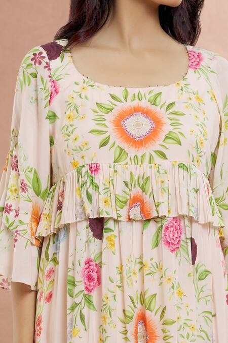 Pink Cotton, Silk Round Neck Frilled Waist Floral Print Dress