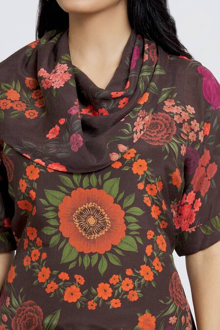 Brown Cotton, Silk Embroidery Cowl Neck Garden Print Dress