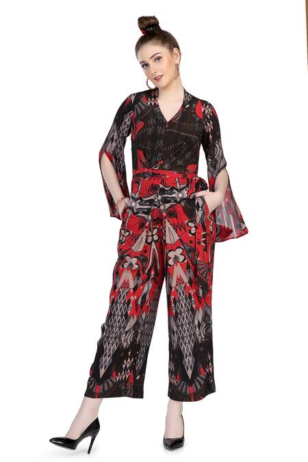 Red Crepe V-neck Graphic Bloom Print Jumpsuit