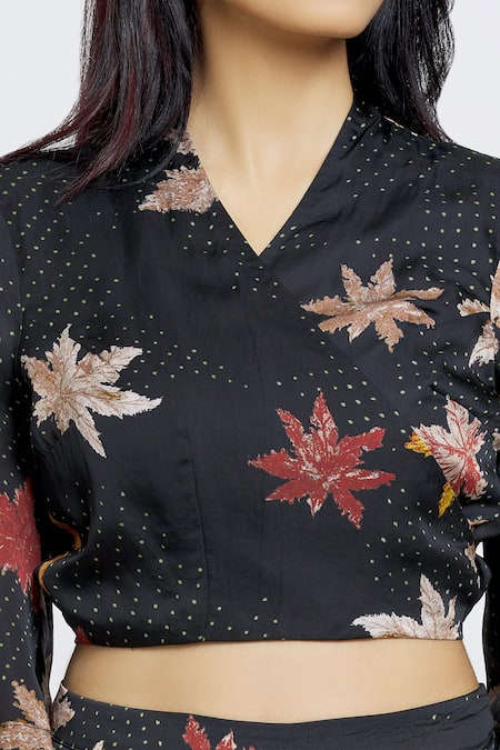 Black wrap top featuring maple dot prints, V neckline, and flared sleeves. Paired with printed flared pants with pleated, gathered detailing.
